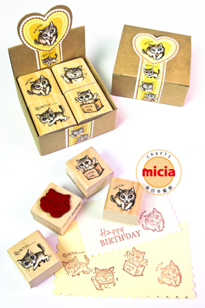 台灣 美日 Micia 四個入小木印章 細緻線條 小貓 字句 4W004